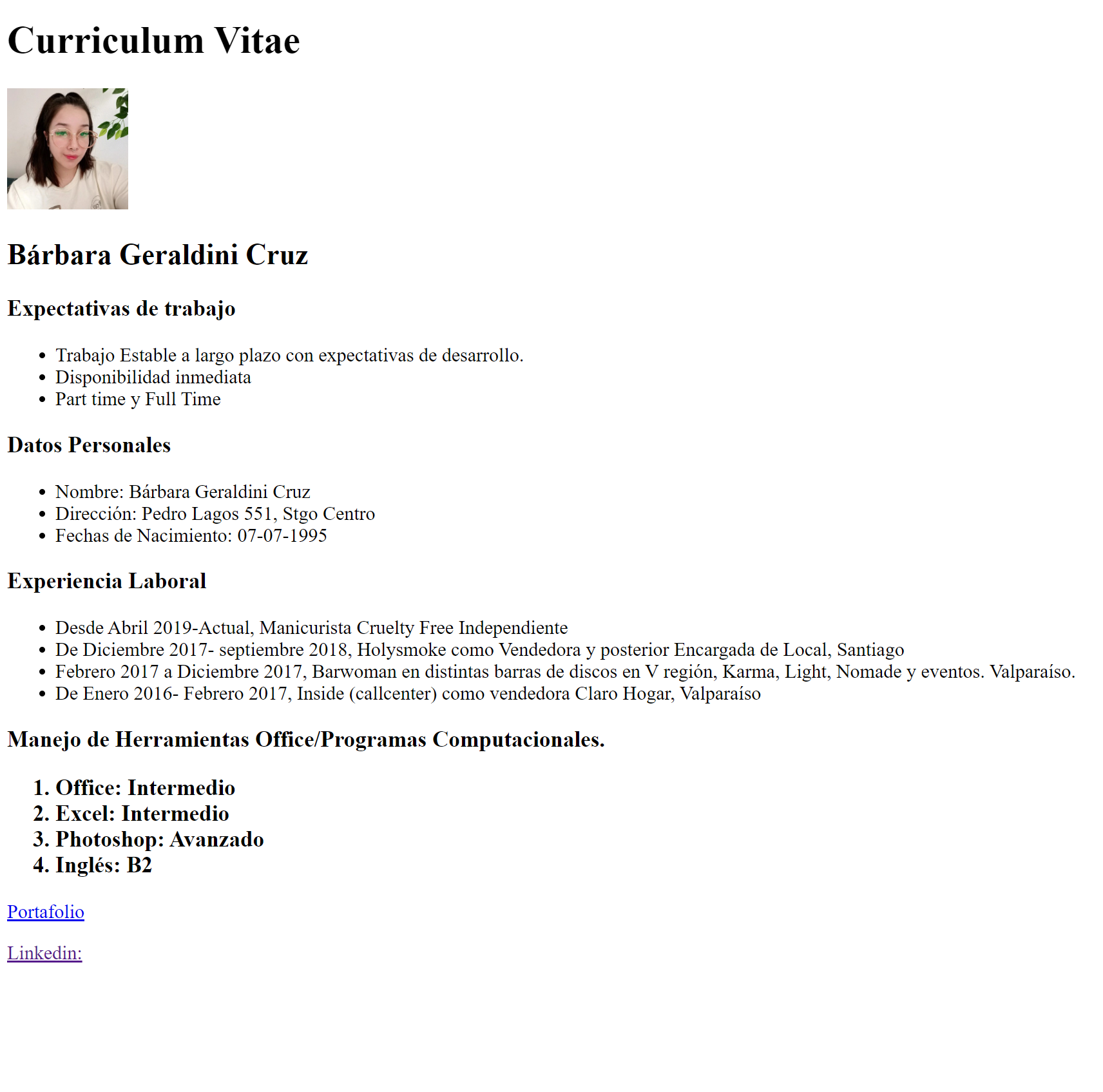 Actualmente, estoy cursando en Desarrollo Full Stack Javascript en Desafío Latam, donde he adquirido competencias en la creación de sitios web responsivos utilizando CSS y Bootstrap. Tambien estoy terminando la carrera de Diseño Gráfico Digital. Me apasiona el área TI, por lo tanto, pretendo seguir especializandome para entreegar el mejor servicio.